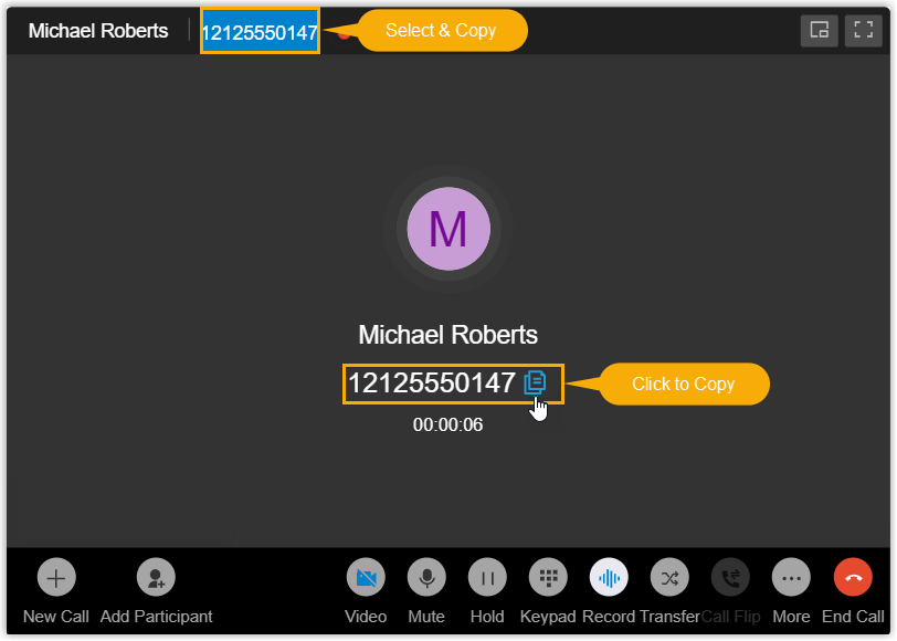 • Optimized call experience: The call window displays the caller ID of the other participant(s) and allows you to conveniently copy it by either of the following methods: