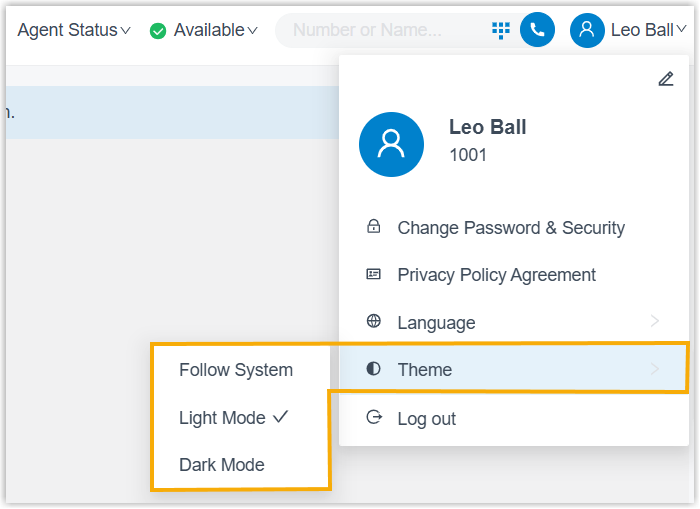 By default, the Linkus Web Client automatically follows the theme setting of your web browser. You can also manually switch the system theme to Light Mode or Dark Mode according to your preference.