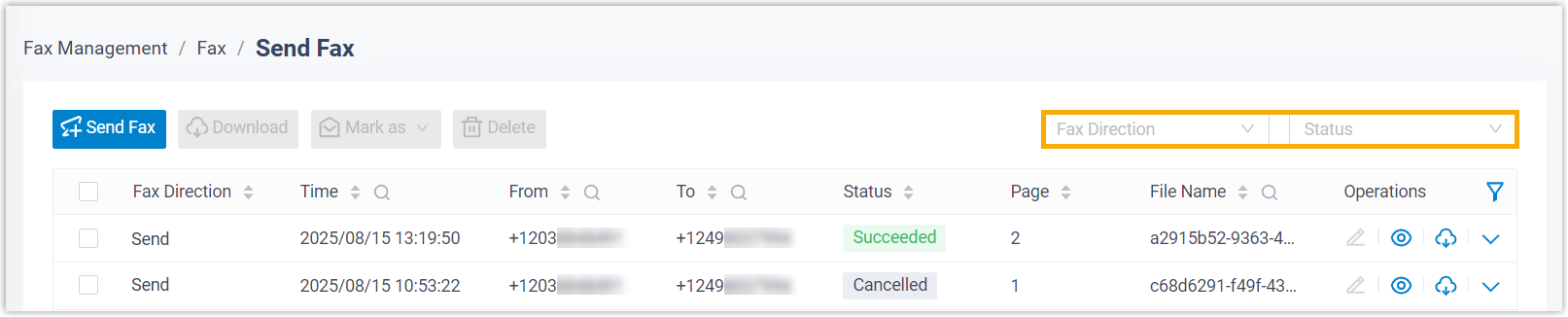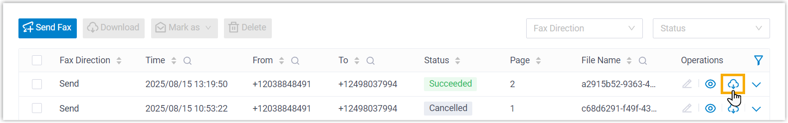 2. Optional: At the top of the list, set filters to locate the fax logs that you want to download.