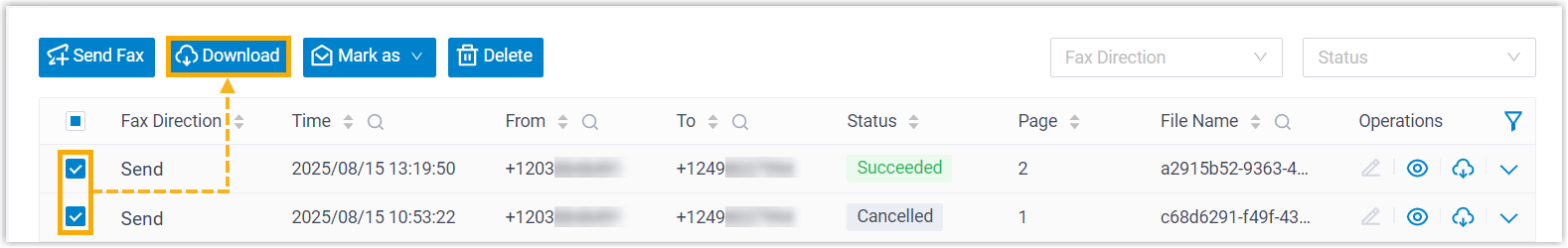 3. Select the checkboxes of the fax logs that you want to download, then click Download.