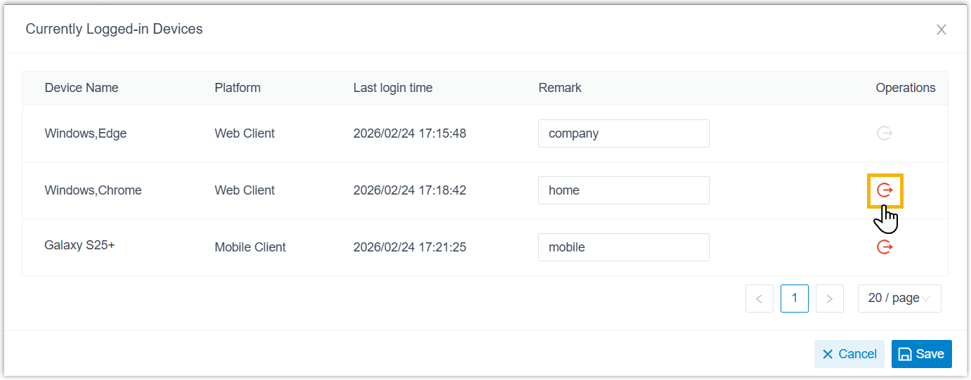 On Linkus Web Client, you can view all Linkus clients logged into your extension and check information of their associated devices (device name, client type, and last login time). In addition, you can add remarks for the devices and log your extension out of specific ones.