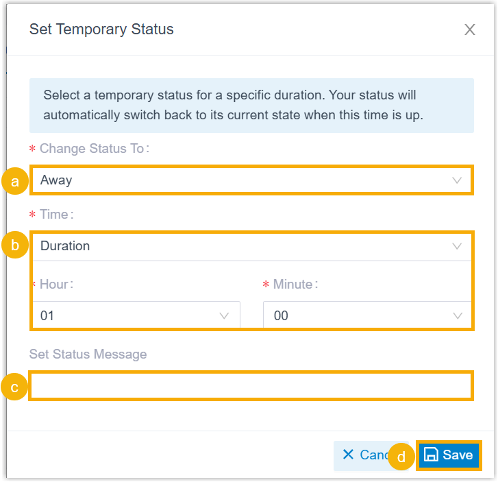 - Optional: In the Set Status Message field, add a personal note to the temporary status.
