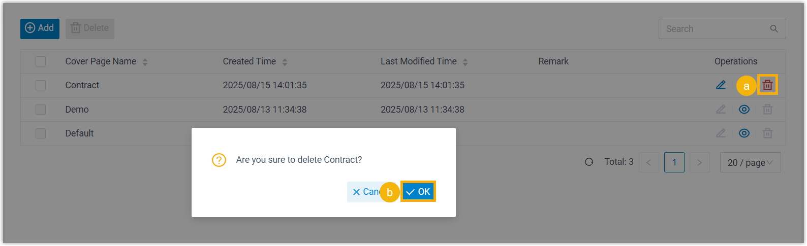 - Select the checkboxes of multiple cover pages, click Delete.