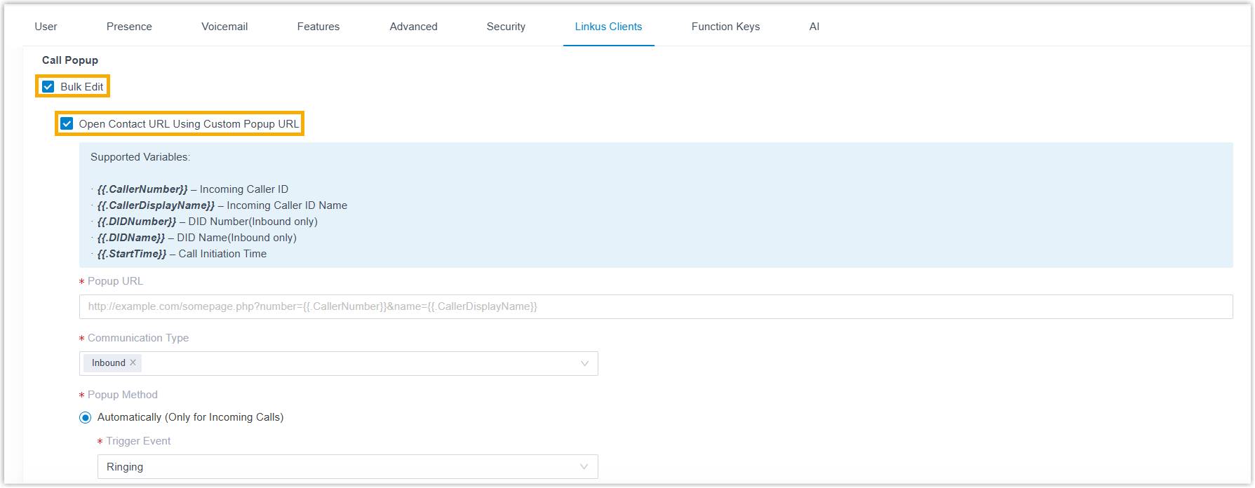 Yeastar supports a lightweight integration with a third-party application (such as CRM system, ERP system, etc.) to achieve call popup via custom popup URL, allowing users to view relevant contact details on the pop-up web page. You can enable call popup for extension users' Linkus Desktop Client or Web Client, and the setting will be synchronized to their Linkus Clients.