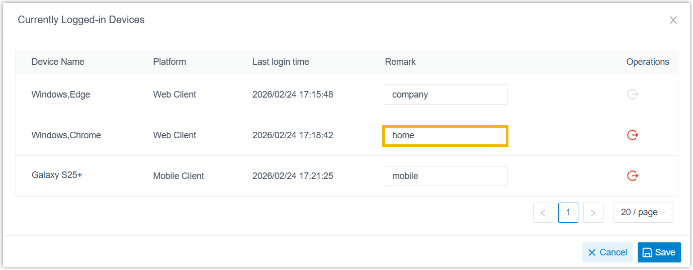 On Linkus Web Client, you can view all Linkus clients logged into your extension and check information of their associated devices (device name, client type, and last login time). In addition, you can add remarks for the devices and log your extension out of specific ones.