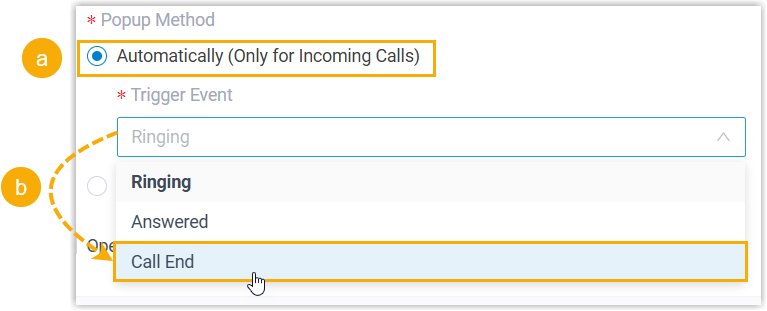 Popup Method Decide the method of call popup. - Automatically popup: If you want the