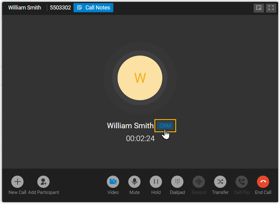 CRMlabel on the call window to manually open the contact's details page during a call.