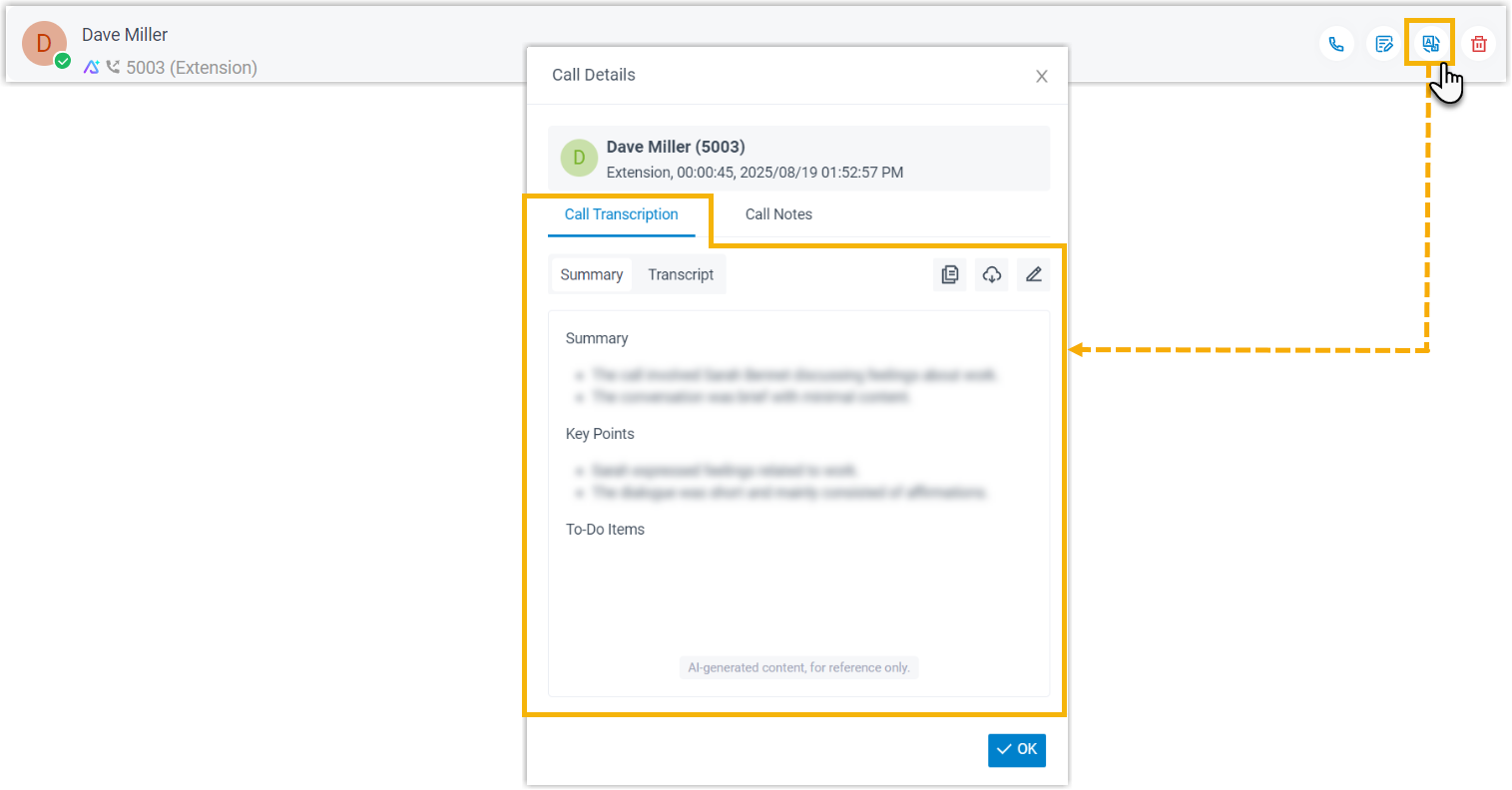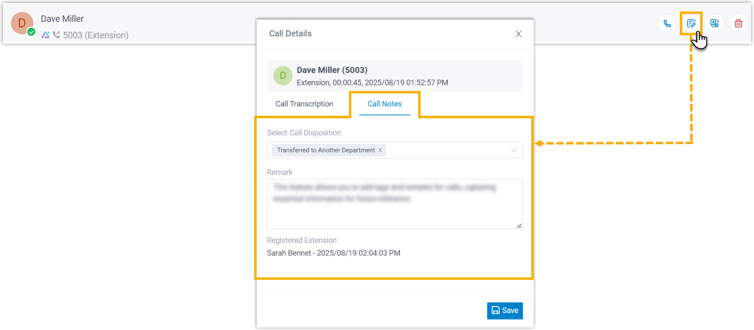 . - In the pop-up window, edit the call note as needed, then click Save.