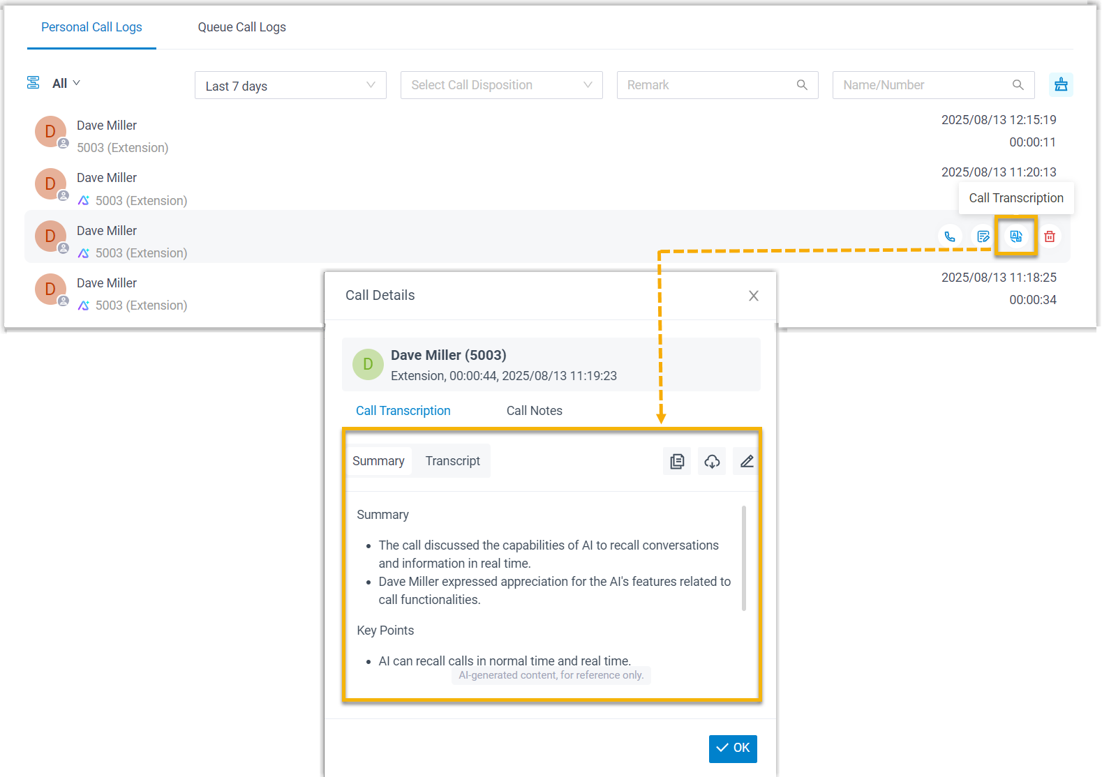 After the call ends, you can review the AI-generated summary and transcript in the call log. Calls that have been transcribed are marked with a