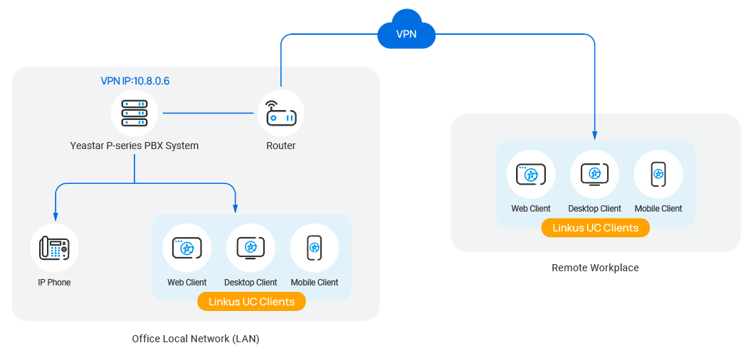If your PBX is connected to a VPN network, the Linkus server is ready to be accessed by the VPN network.