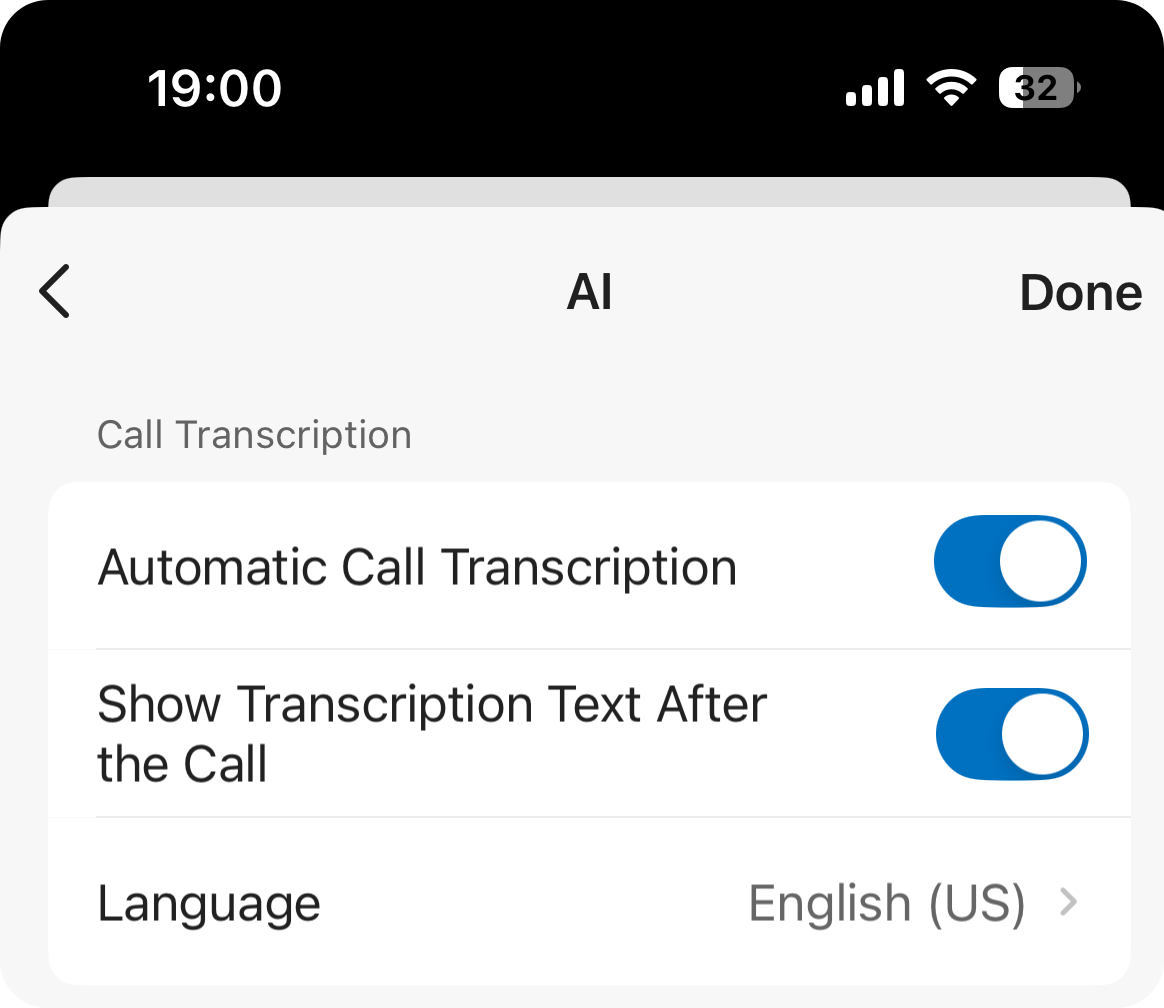 Show Transcription Text After the Call Specify whether to automatically display the transcript and summary after the call ends. Language Select the desired language for call transcription. - At the top-right corner, tap Done.
