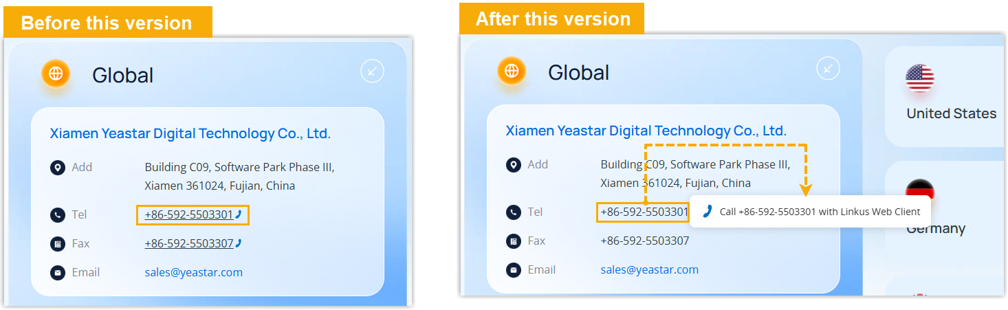 Change Before this version After this version Number display Detected phone numbers were automatically converted into underlined, clickable links. When a user hovers over a detected phone number, a pop-up appears. Calling action Click the detected phone number to call out. Hover mouse over the detected phone number, and click on the pop-up to call out.