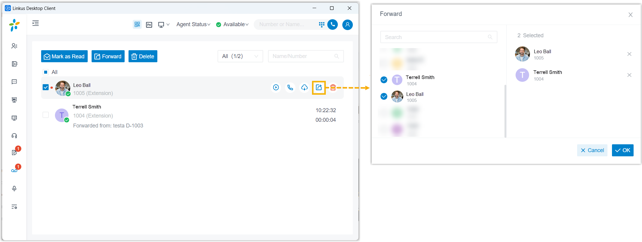 - When you dial feature code to play a voicemail forwarded from another extension, the Linkus client will play a voice prompt that includes the number of the extension from which the voicemail was forwarded.