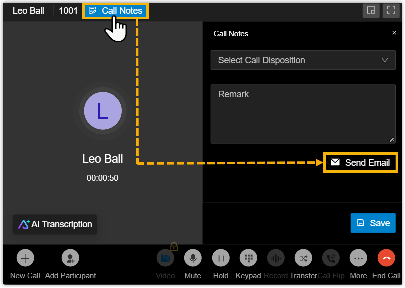 To streamline your call follow-up process, you can email call details, such as contact information, call notes, and AI call summary from the Linkus client. This feature is available both during an active call and after the call ends.