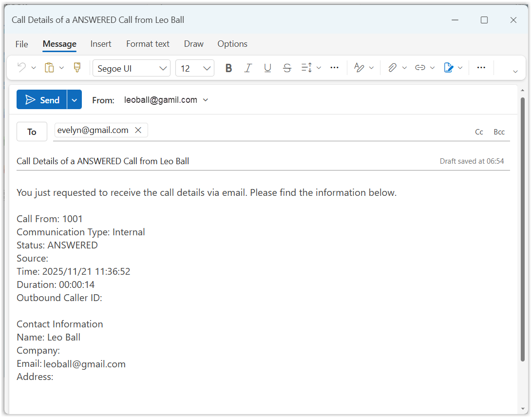 The Linkus client automatically launches the specified email client (a desktop application or a web application) and creates a new email that is pre-filled with the recipient's email address, a subject, and a body containing the call details.Scenario Method Send call details during an active call - If the call note feature is available, click .