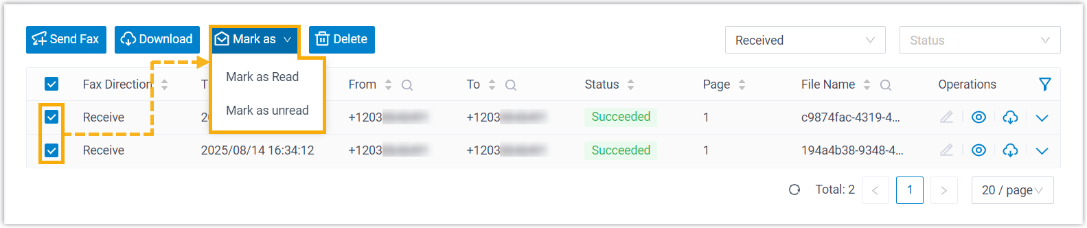 3. Select the checkboxes of the desired faxes, click Mark as, then select an option to change the read status.