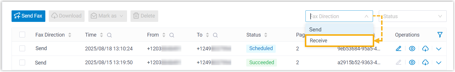 2. Optional: At the top of the list, set Fax Direction to Receive to filter the inbound faxes.
