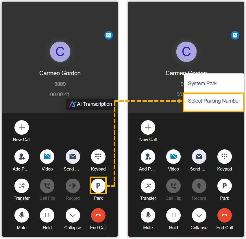 During an active call, you can directly click button on the call window to park the call on a system-assigned or manually selected parking number.