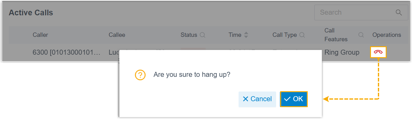 Note:- The hangup action is recorded in the Operation Logs (under the Status Center module) and the CDR (with the reason shown as Administrator Hung up).