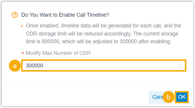 Modify Max Number of CDR.Important: CDR storage limit is determined by the server hosting the PBX. Exceeding the limit could result in new CDRs not being recorded and may impact system stability.