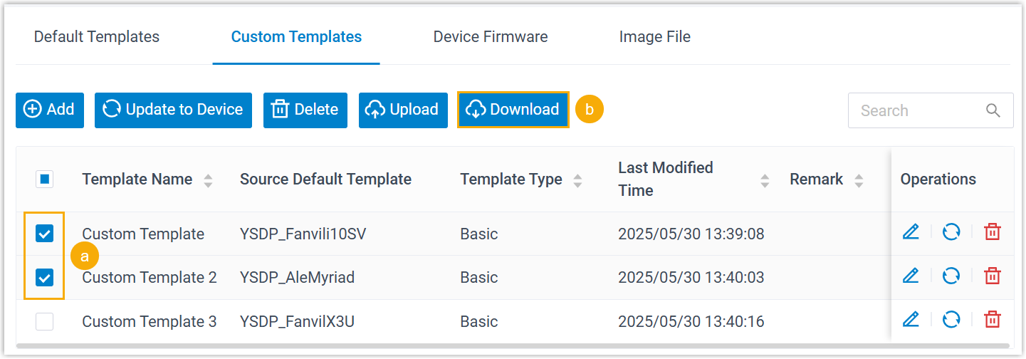 beside the desired template. - To update the configuration of multiple templates, select the checkboxes of desired templates, click Update to Device.