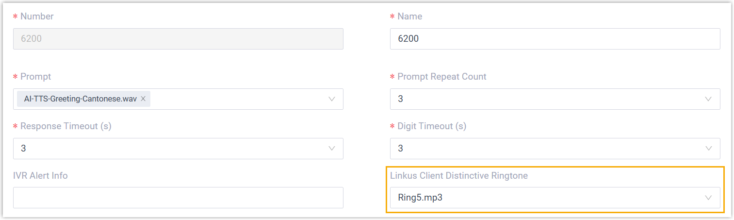 • If the call is from a contact with a distinctive ringtone set in the user's Linkus client, the contact’s distinctive ringtone will take priority over the IVR ringtone.
