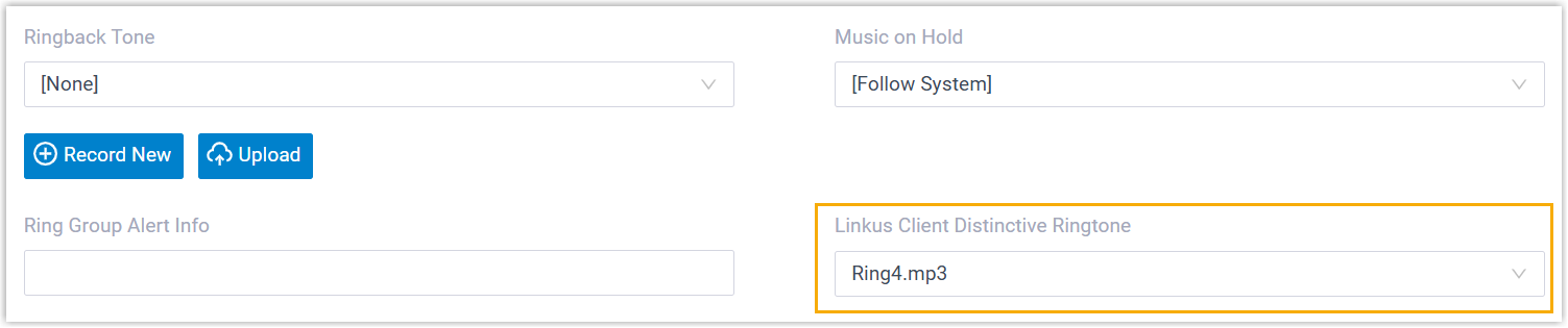 2. In the Linkus Client Distinctive Ringtone drop-down list, select or upload a desired ringtone.