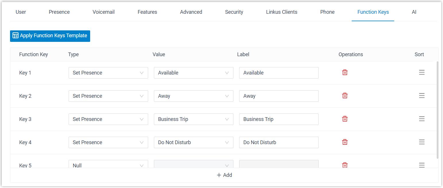 This topic describes how to configure function keys for extensions on PBX web portal, allowing extension users to quickly switch to a specified extension presence on their Linkus clients or IP phone via the function keys.