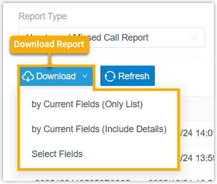 - by Current Fields (Include Details): Download the data displayed in the list (with current fields shown in the list) and callback details.