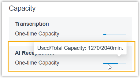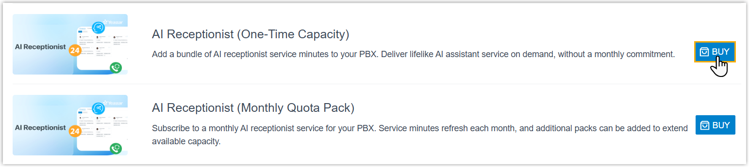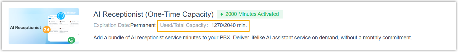 - AI Receptionist (One-Time Capacity): One-time receptionist minutes. When used up, you need to purchase additional capacity.
