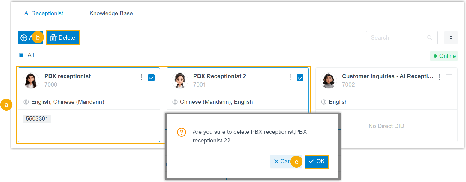 - In the AI receptionist list, delete one or more receptionists according to