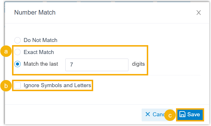 Note: The default value is 7. You can enter a value between 4 and 31. - Optional: To ignore symbols and letters in numbers during contacts matching, select the checkbox of Ignore Symbols and Letters.