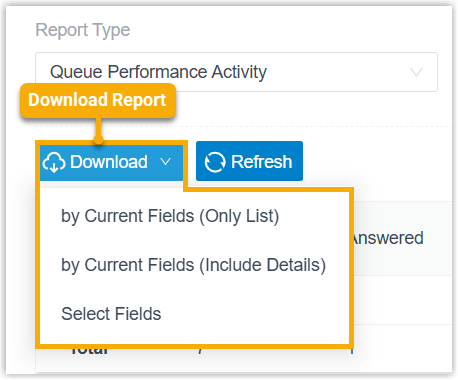 • by Current Fields (Include Details): Download the data displayed in the list (with current fields shown in the list) and queue call details.