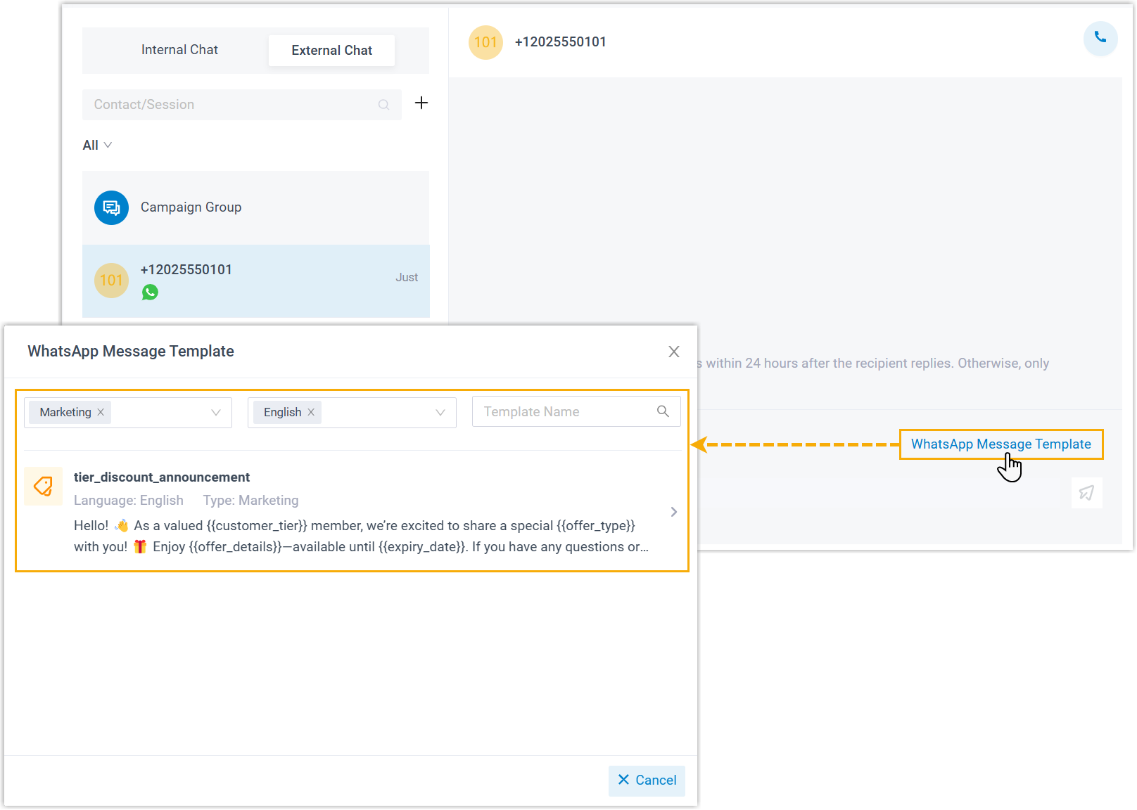 - To initiate a session via the WhatsApp channel, only WhatsApp-approved message templates can be used. Ensure that the desired templates have been synchronized to the PBX.