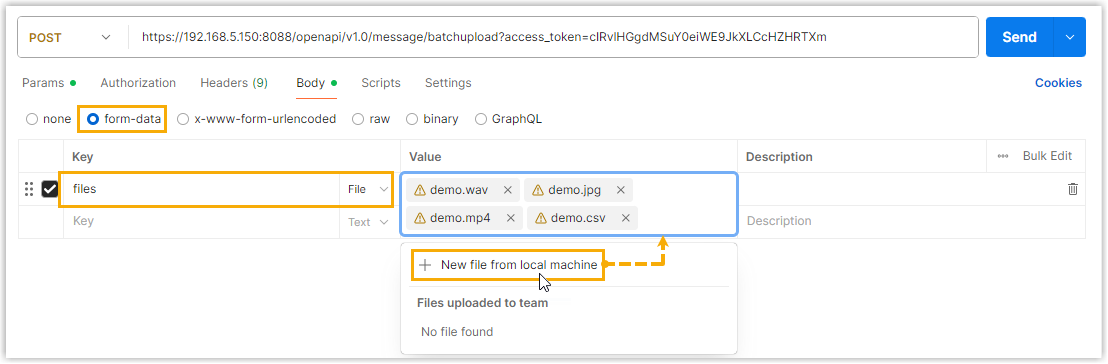 | files | Yes | file | List of file resources, uploaded via form-data. Note: Supports to upload multiple