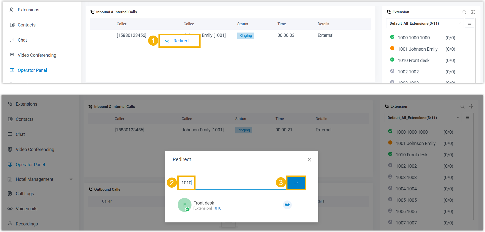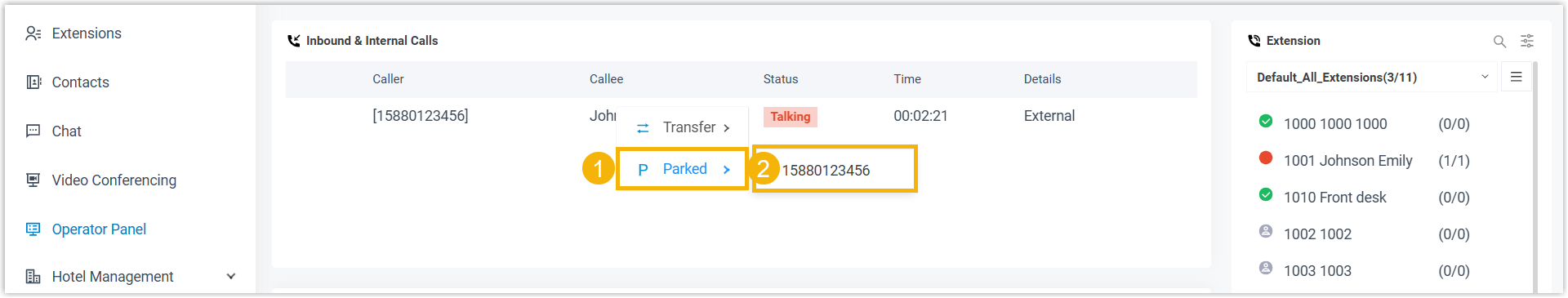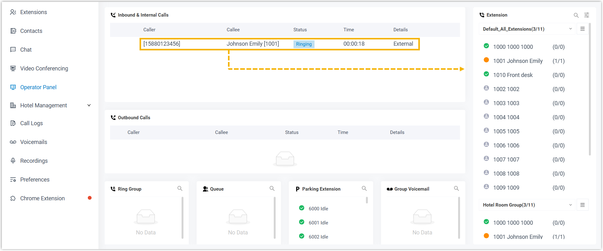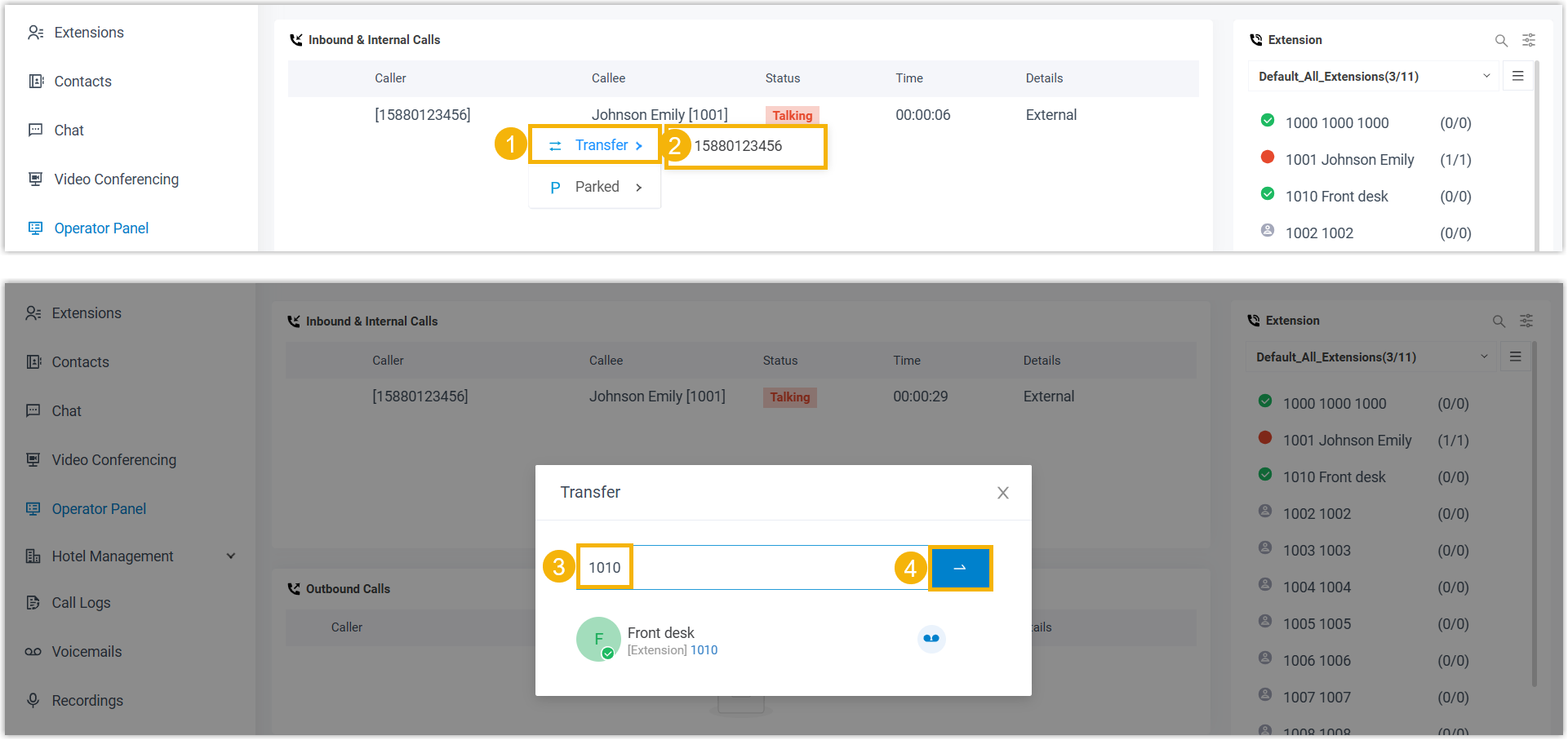 In some cases, front desk may need to manage guest calls, such as transferring calls to another room. This topic describes how front desk can manage guests calls from Operator Panel.