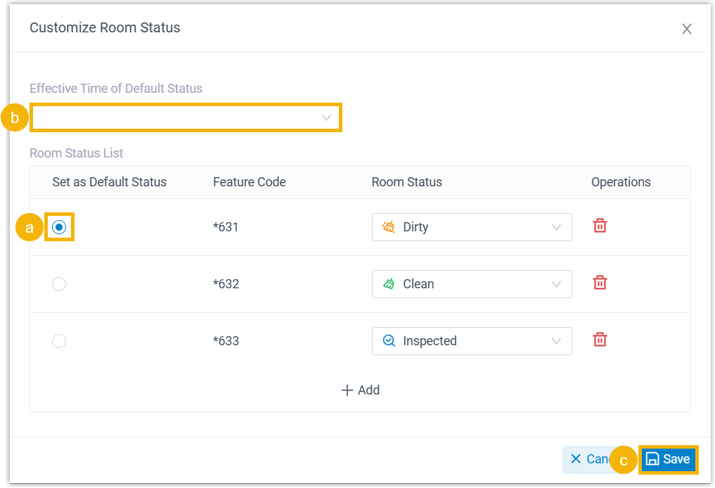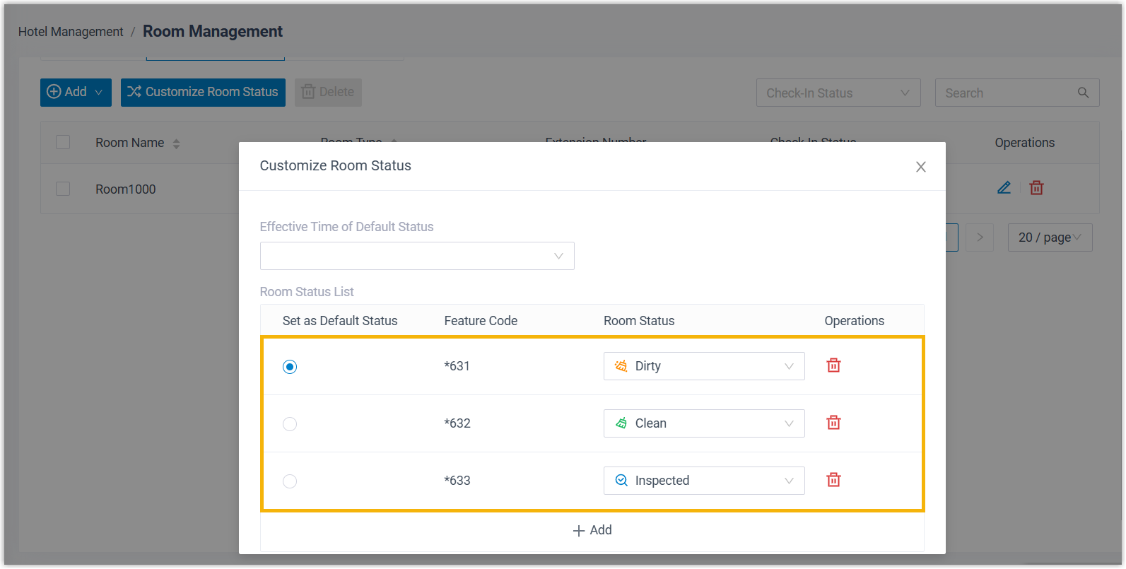 - Yeastar provides 6 built-in room status - Dirty, Clean, Inspected, Repairing, Available, and Unavailable, along with feature codes to facilitate housekeeping management. You can also customize desired room status as needed, as shown below.