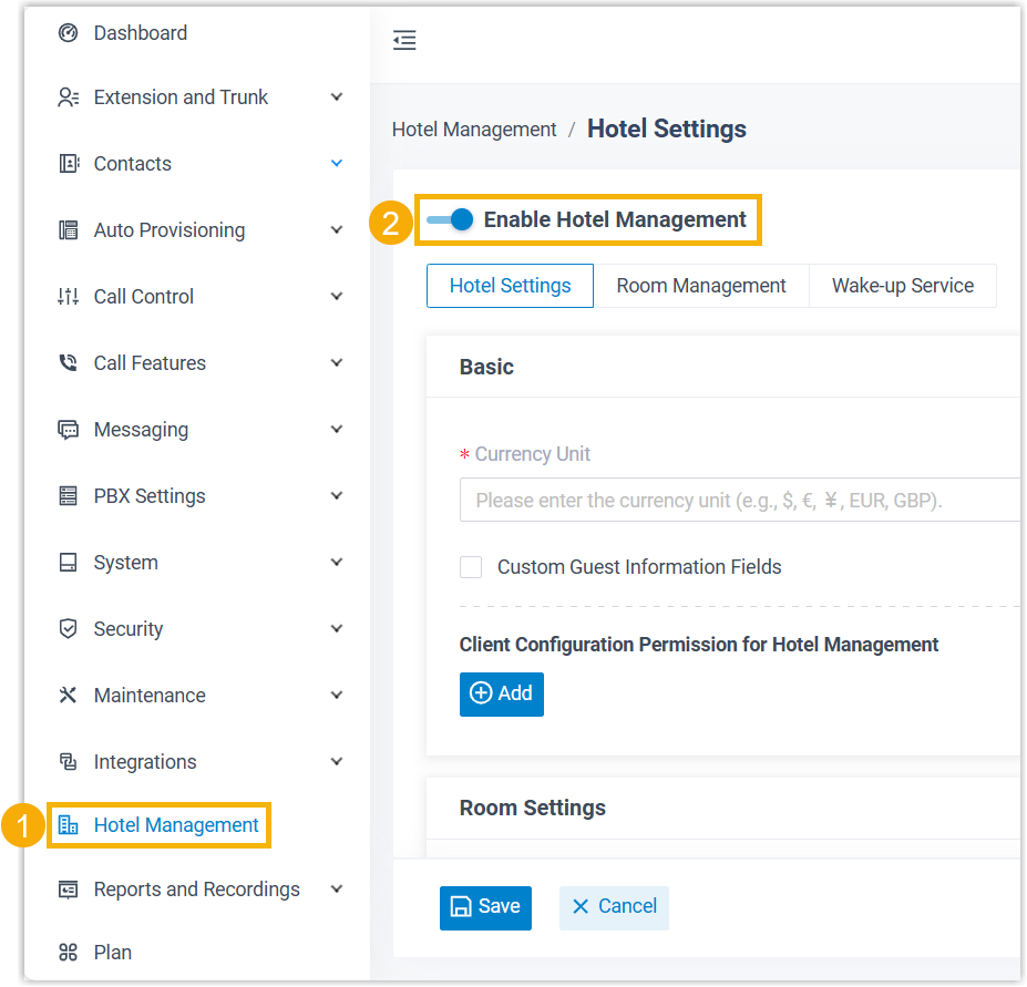 - Log in to PBX web portal, go to Hotel Management.