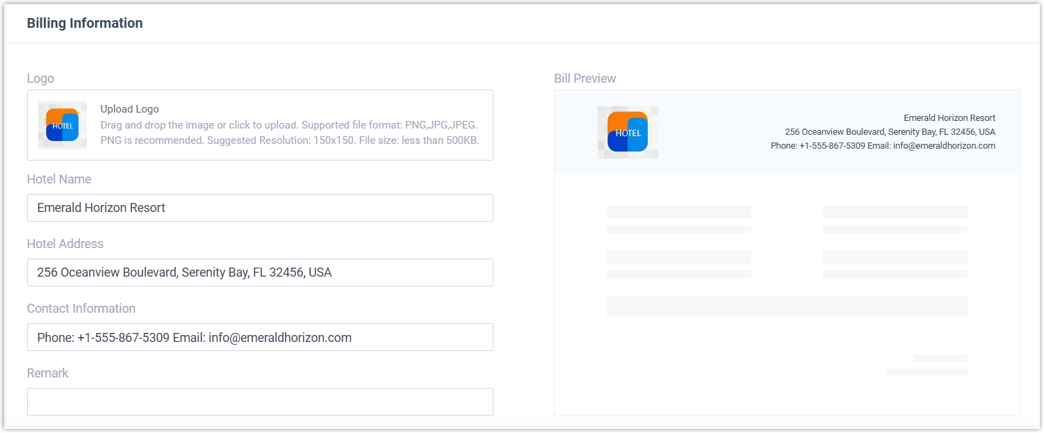 - Hotel Information will be used in all billing and invoicing transactions.