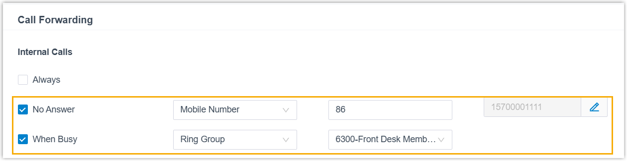 Configuration Instruction Call forwarding To ensure calls are automatically routed to a backup number (e.g. user's mobile number) when the extension user is not available, complete the following settings: - In the Call Forwarding section, select the checkbox of the unavailable conditions (No Answer or When Busy) for internal calls.