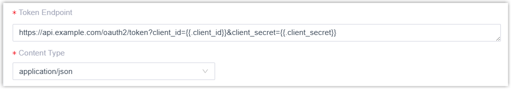 https://www.api.example.com/oauth/v2/token?client_id={{.client_id}}&client_secret={{.client_secret}}Content Type Select the content type of the token retrieval request. Scope Optional. Enter the scope to specify the data in the CRM that the PBX is allowed to access. Note: Use comma to separate multiple fields.For example,