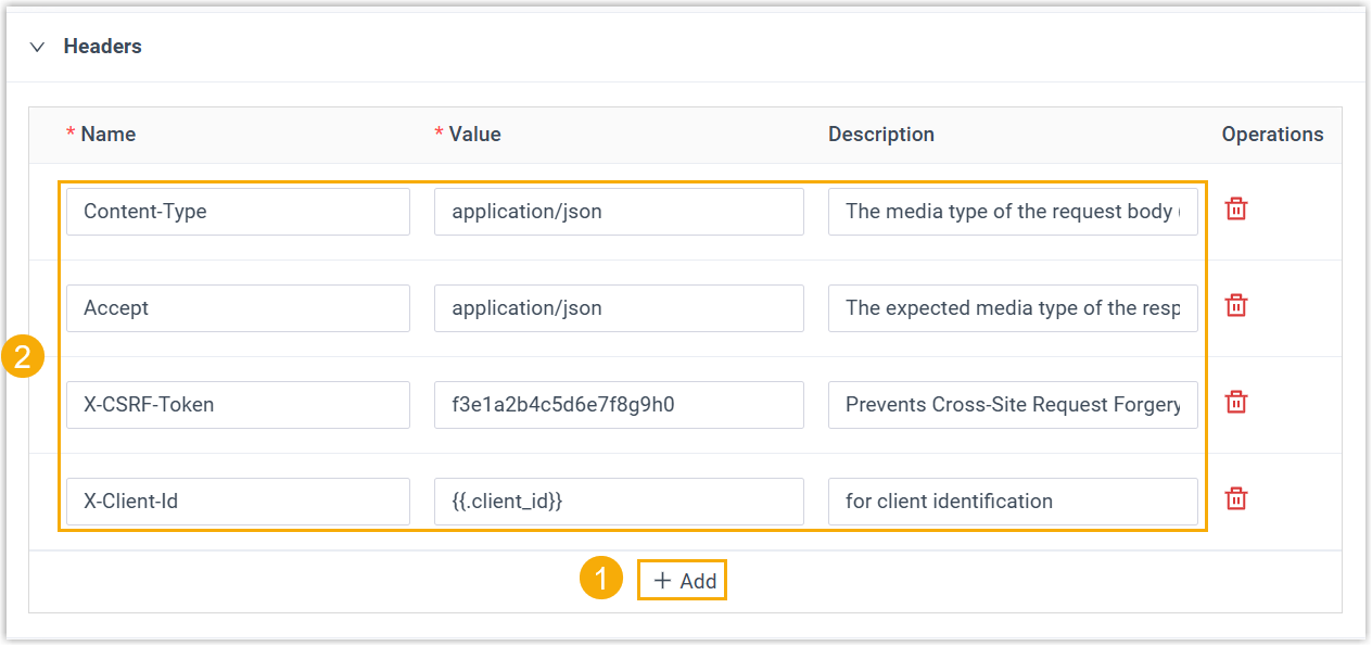 Setting Description Name Header name, such as Content-Typefor content type orAcceptfor expected data format.Value Header value, either a specific value or a variable. Note: The variables defined in the Authentication Method can also be used. For example, if a variable namedclient_idis set, you can reference it in the header value as{{.client_id}}.Description A brief explanation of the header’s function or purpose for reference.