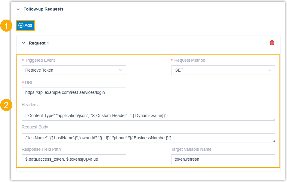 {"Content-Type":"application/json", "X-Custom-Header": "{{.DynamicValue}}"}Request Body Define the data payload of the request as a JSON object. You can use {{.varname}} to insert dynamic values. For example,{"lastName":"{{.LastName}}","ownerId":"{{.Id}}","phone":"{{.BusinessNumber}}"}Response Field Path Define the JSON path to extract data from the response of this follow-up request. Note: Use commas,to separate multiple paths. For example,$.data.access_token, $.tokens[0].valueTarget Variable Name Define the name of the system variable to store the value extracted from the response. These can be existing variables or new custom variables. Note:- Use commas