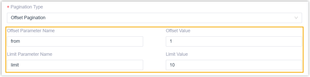 - Offset Parameter Name: Enter the parameter name used to specify the initial offset position for pagination.