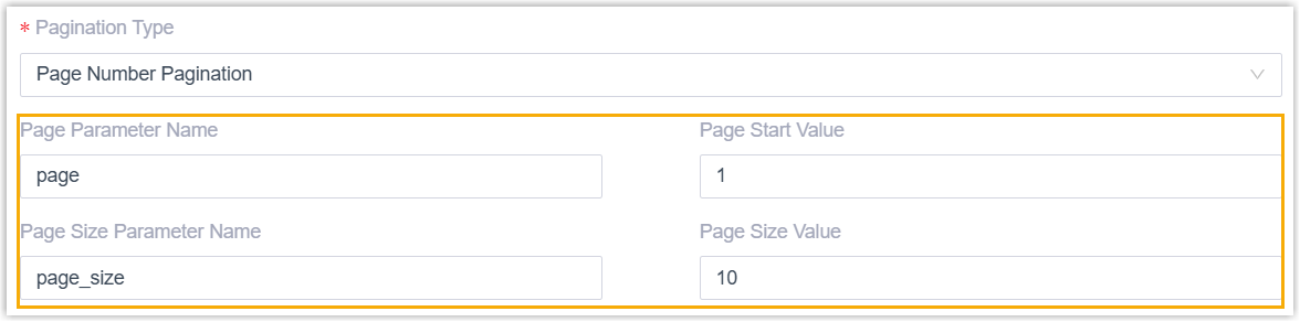 - Page Size Parameter Name: Enter the parameter name used to specify the number of records per page in API requests.