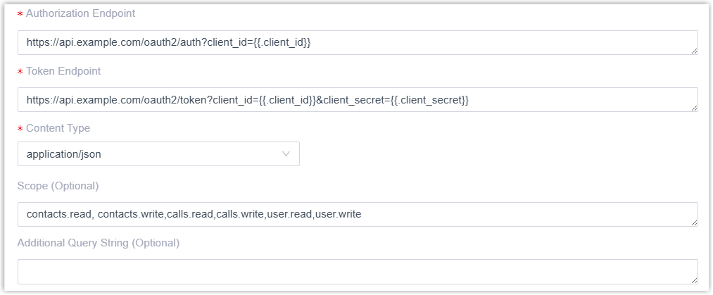 contacts.read,contacts.write,calls.read,calls.write,user.read,user.writeAdditional Query String Optional. If the CRM system authenticates requests using query parameters instead of scope, add the query parameters in this field. For example,