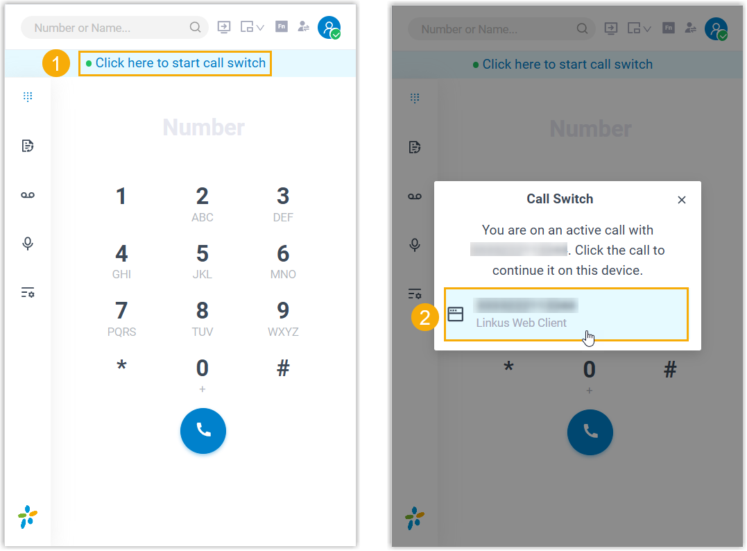 Call Switch feature allows you to retrieve an active call from the original device (with your extension registered), and continue it on 'Linkus for Dynamics 365', without any interruption to the conversation.