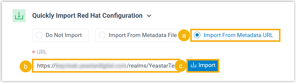 - Import Red Hat SSO configurations via metadata XML file or metadata URL.
