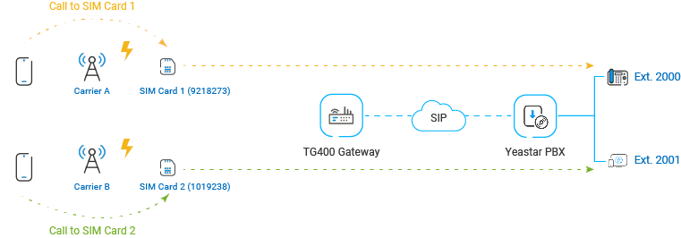On Yeastar TG400 gateway, create an 'Mobile to IP' route for carrier A, and create another one for carrier B, so as to route incoming calls to Yeastar PBX system.