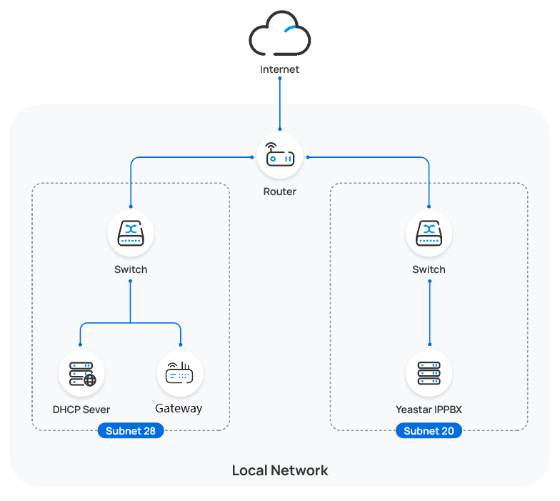 while the Yeastar PBX (IP: 192.168.20.58) is deployed in subnet